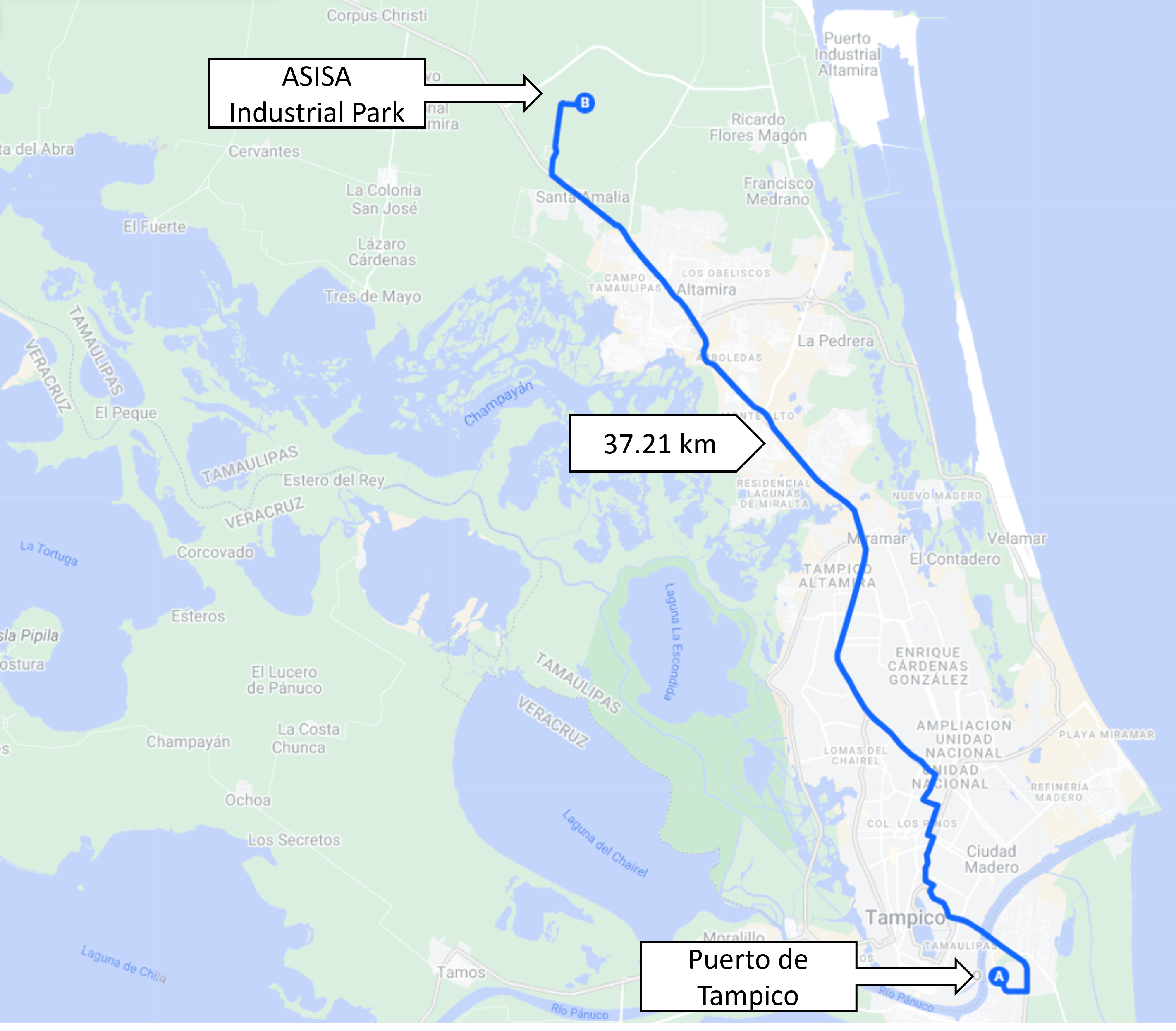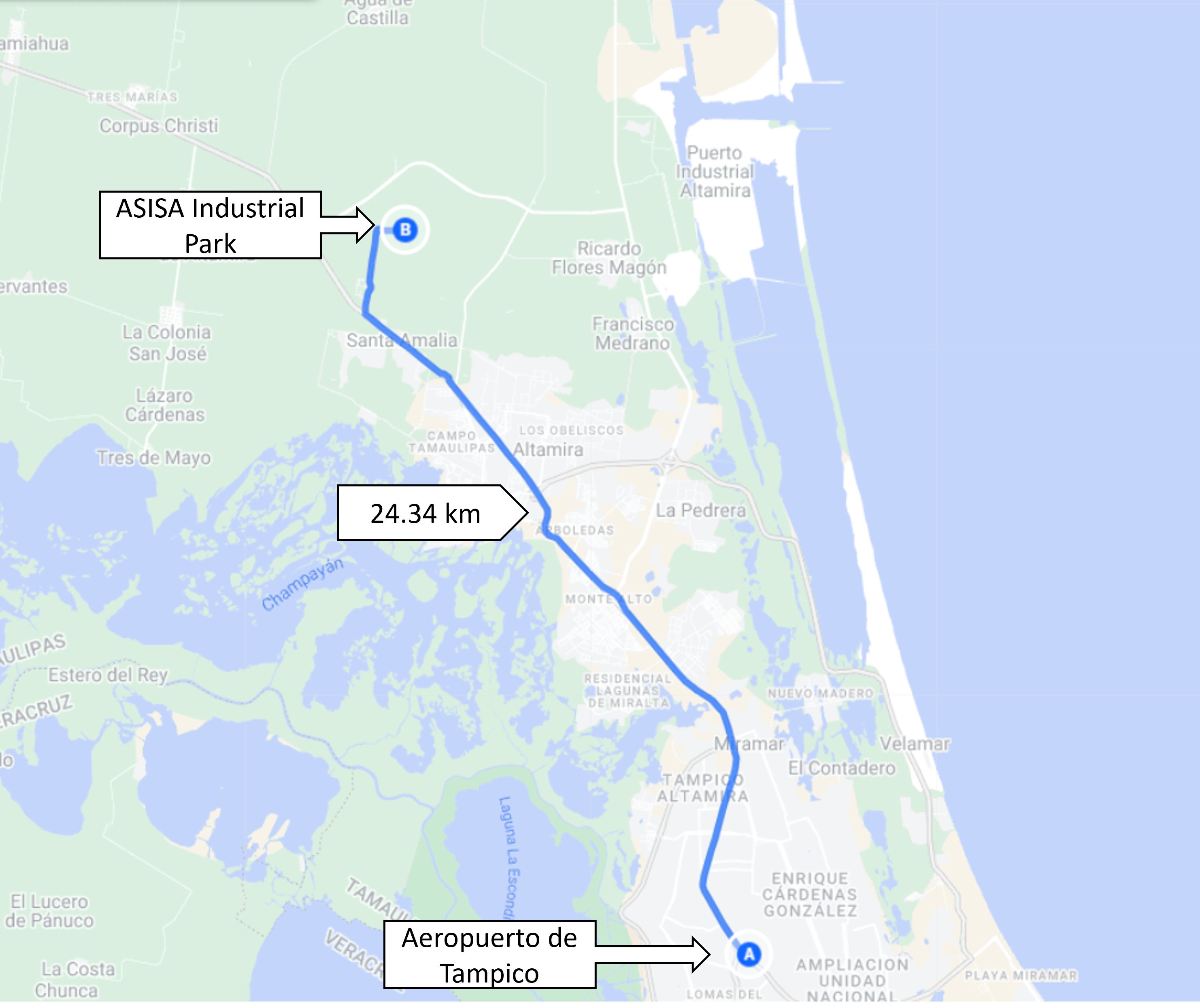 A 40 minutos del Aeropuerto Internacional de Tampico con una distancia de 24 km.